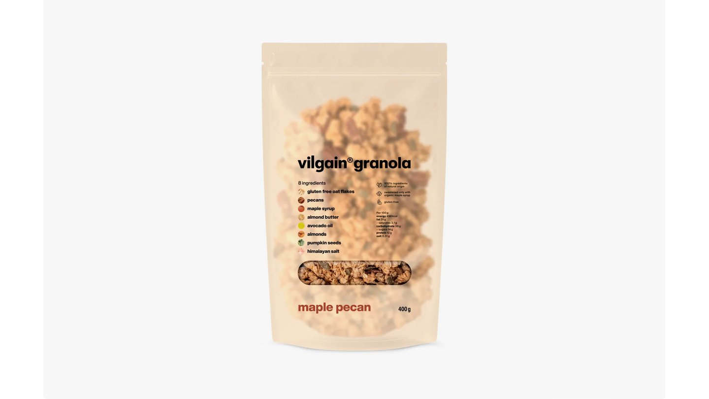 Ingredience Bezlepkové ovesné vločky 37 %, pekany 18 % (pekanový krém, pekanové ořechy), javorový sirup* 18 %, mandlový krém, avokádový olej*, mandle ořechy, dýňová semínka*, himalájská sůl. *z ekologického zemědělství Upozornění pro alergiky: alergeny jsou vyznačeny tučně ve složení výrobku. Výrobek může obsahovat stopy mléka, arašídů, dalších skořápkových plodů, siřičitanů/SO2 a sezamu. Výživové údaje 100 g Energetická hodnota 2148 kJ / 516 kcal Tuky 31 g - z toho nasycené mastné kyseliny 3,3 g Sacharidy 43 g - z toho cukry 16 g Vláknina 8,1 g Bílkoviny 12 g Sůl 0,29 g