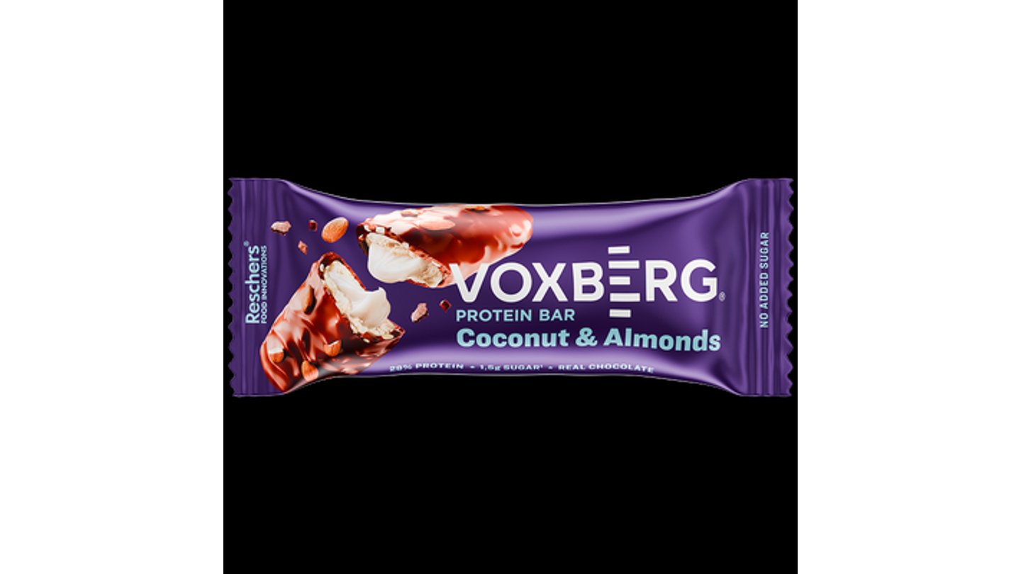 Proteínová tyčinka s kokosom v mliečnej čokoláde. Obsahuje sladidlá. Obsahuje prírodné cukry. Zloženie: mliečne bielkoviny 22%, mliečna čokoláda so sladidlom 22% (sladidlo: maltitol; kakaové maslo, sušené plnotučné mlieko, kakaová hmota, kakaový prášok so zníženým množstvom tuku, emulgátor: lecitíny; prírodná aróma), sladidlo: maltitol; krém (sladidlo: maltitol; rastlinný tuk (kokosový), mliečne bielkoviny, emulgátor: lecitíny; kakaové maslo, jedlá soľ, aróma), zvlhčovadlo: glycerol; hydrolyzovaný kolagén, vláknina z koreňa čakanky, repkový olej, strúhaný kokos 2%, sekané mandle pražené, emulgátor: lecitíny; arómy, jedlá soľ, sladidlo: sukralóza. Nadmerná konzumácia môže mať laxatívne účinky. Môže obsahovať glutén (max. 20 mg/kg), vajcia, sóju, sezam, arašidy a orechy. Výživové údaje na 100 g Energia 1697 kJ/407kcal Tuky 20 g z toho nasýtené mastné kyseliny 9,0 g Sacharidy 38,1 g z toho cukry 3,0 g Z toho polyoly 27 g Vláknina 3,0 g Bielkoviny 28 g Soľ 0,41 g