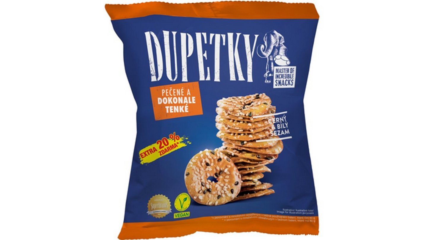 Tenké, pečené slané preclíky s jemnou oříškovou chutí, posypané černým a bílým sezamem, které představují lehčí variantu snacku.