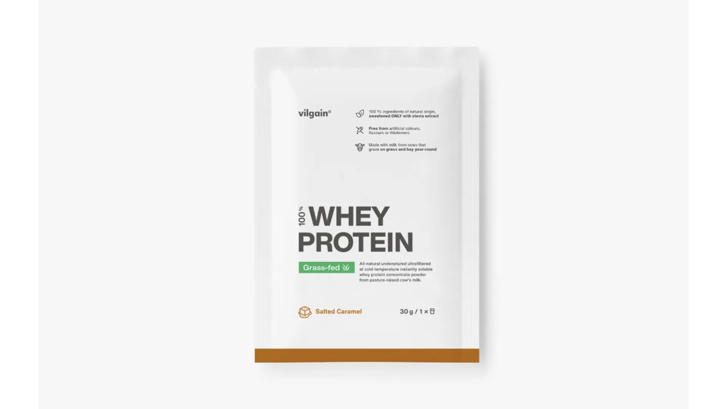 Ingredience: Ultrafiltrovaný syrovátkový proteinový koncentrát 92 % (mléko, emulgátor: slunečnicový lecitin), přírodní aroma, barvivo: karamel, Himalájská sůl 1 %, sladidlo: steviol‑glykosidy. Upozornění pro alergiky: alergeny jsou vyznačeny tučně ve složení. Může obsahovat arašídy a skořápkové plody. Výživové údaje: 100 g 30 g Energetická hodnota 1655 kJ / 391 kcal 497 kJ / 117 kcal Tuky 5,7 g 1,7 g - z toho nasycené mastné kyseliny 3,7 g 1,1 g Sacharidy 13,3 g 4 g - z toho cukry 8,4 g 2,5 g Bílkoviny 71,6 g 21,5 g Sůl 1,4 g 0,40 g
